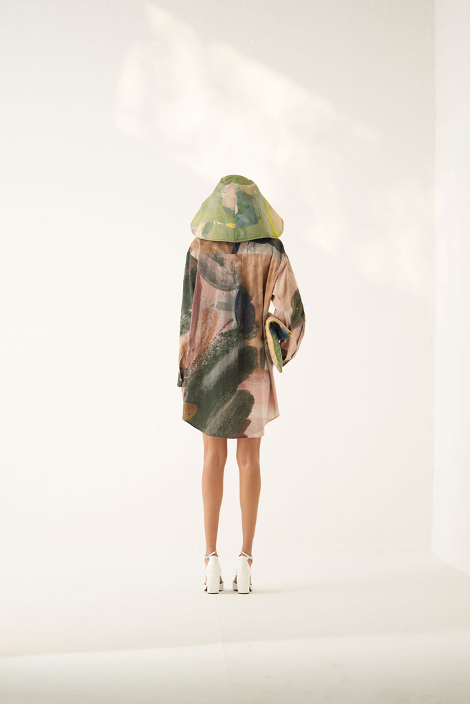 GOT Certified Azo-free dyes, Anti-Fit,Hand-painted abstract expressionist digitally transferred print, High- Low length, Full Placket, Shirt Collar, Back yoke with box pleat.