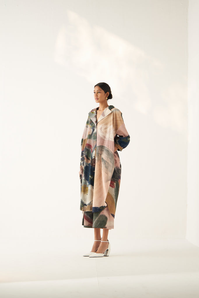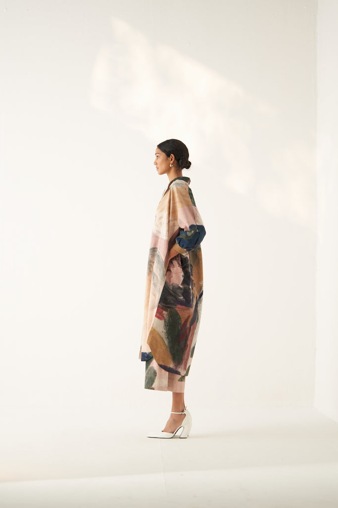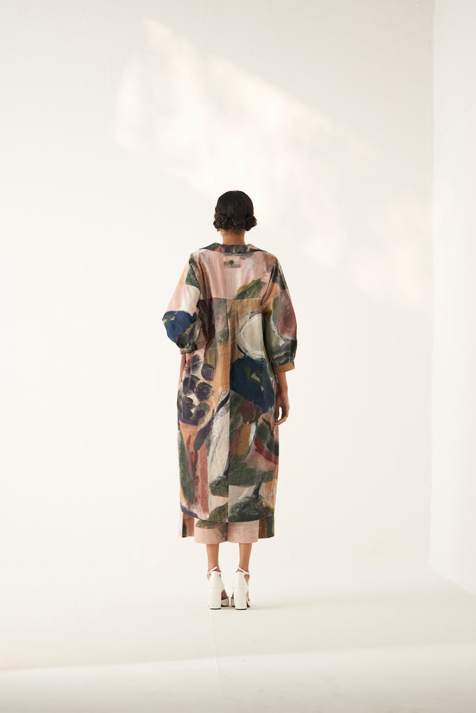 UPPER: • GOT Certified Azo-free dyes, Anti-Fit,Hand-painted abstract expressionist digitally transferred print, Gathered sleeves, Back yoke, Box pleat, Hand-embossed vintage Indian coin detail.