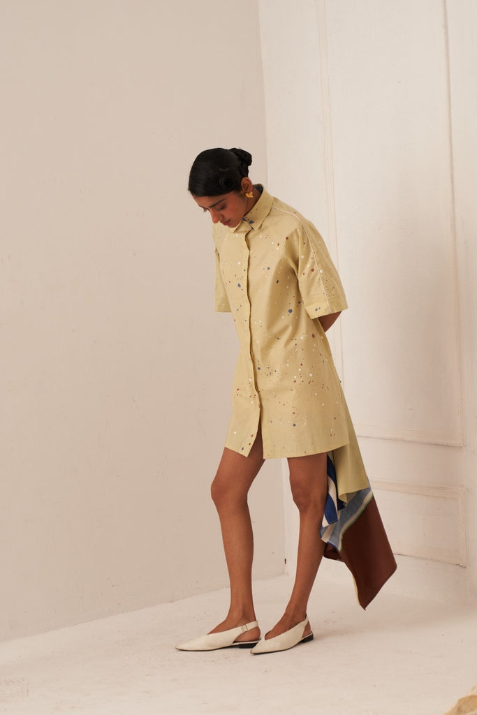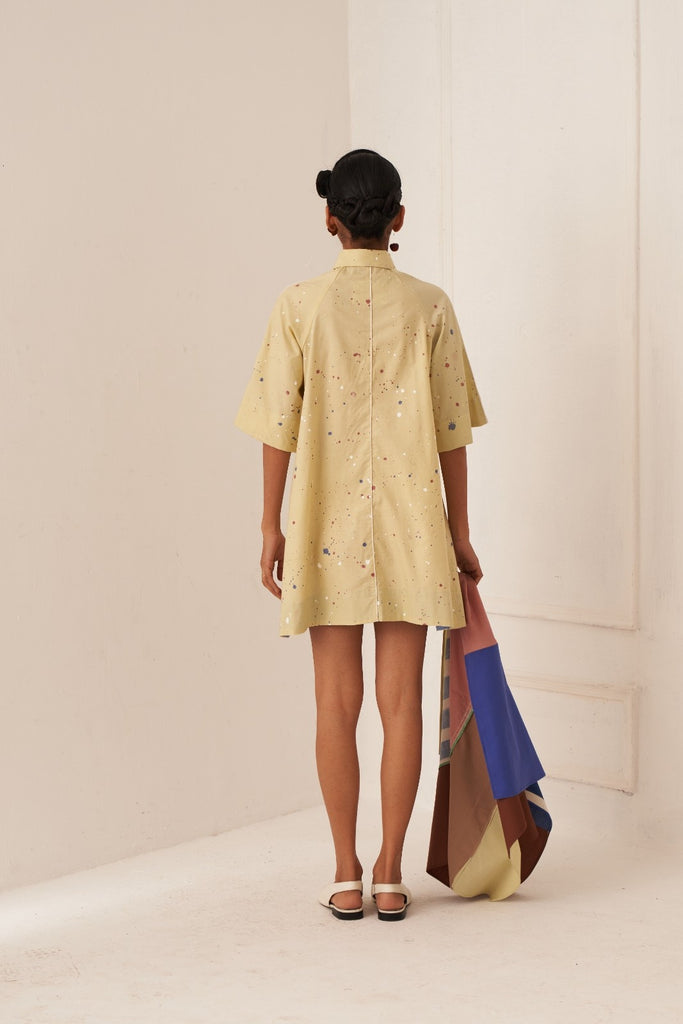 The WC Limon Aline Short is an Anti-Fit A-line shirt dress featuring a hand-painted splatter pattern for a distinctive look. This dress includes a shirt collar, concealed placket, side seam pockets, and raglan sleeves for added comfort and style. The center back insert and hand-embossed vintage Indian coin detail on the back give it a signature touch.