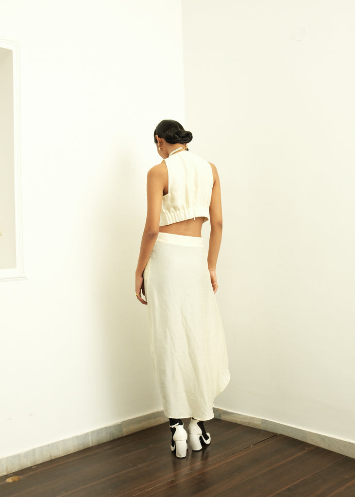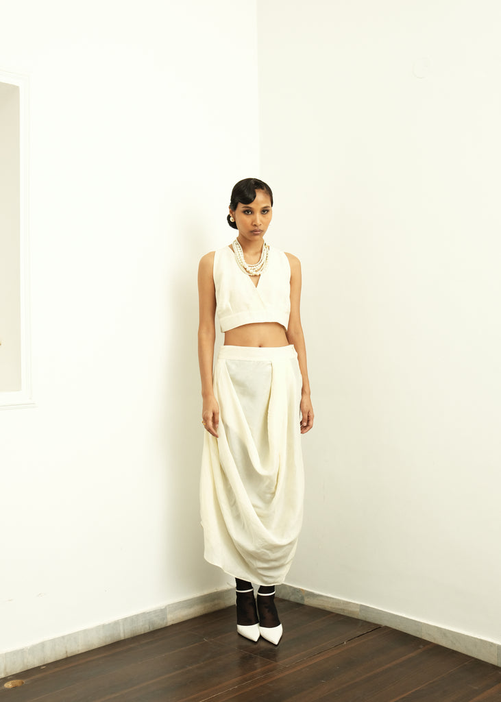 - The Poem Drape Skirt is a stunning draped contemporary piece that embodies versatility and elegance. Designed to be paired effortlessly with off-shoulder tops or shirts, this skirt is a must-have staple for your festive wardrobe. Featuring a fixed belt with a side opening, it offers both comfort and style, allowing you to move gracefully while making a fashion statement.