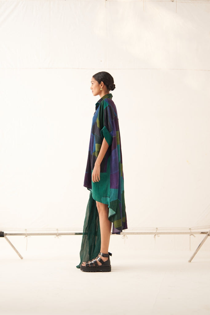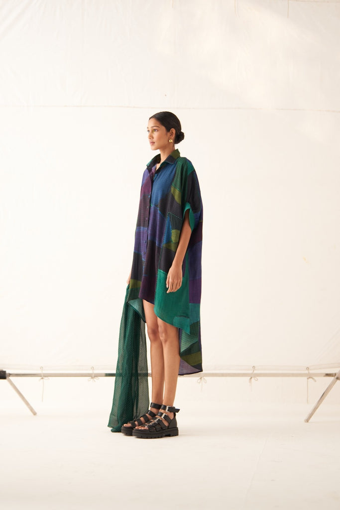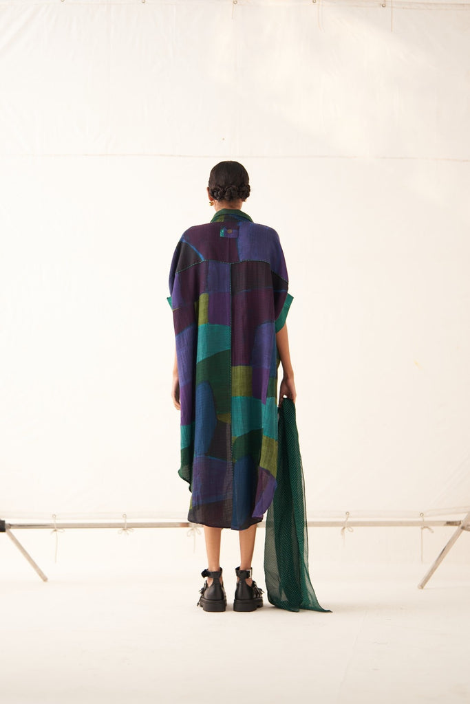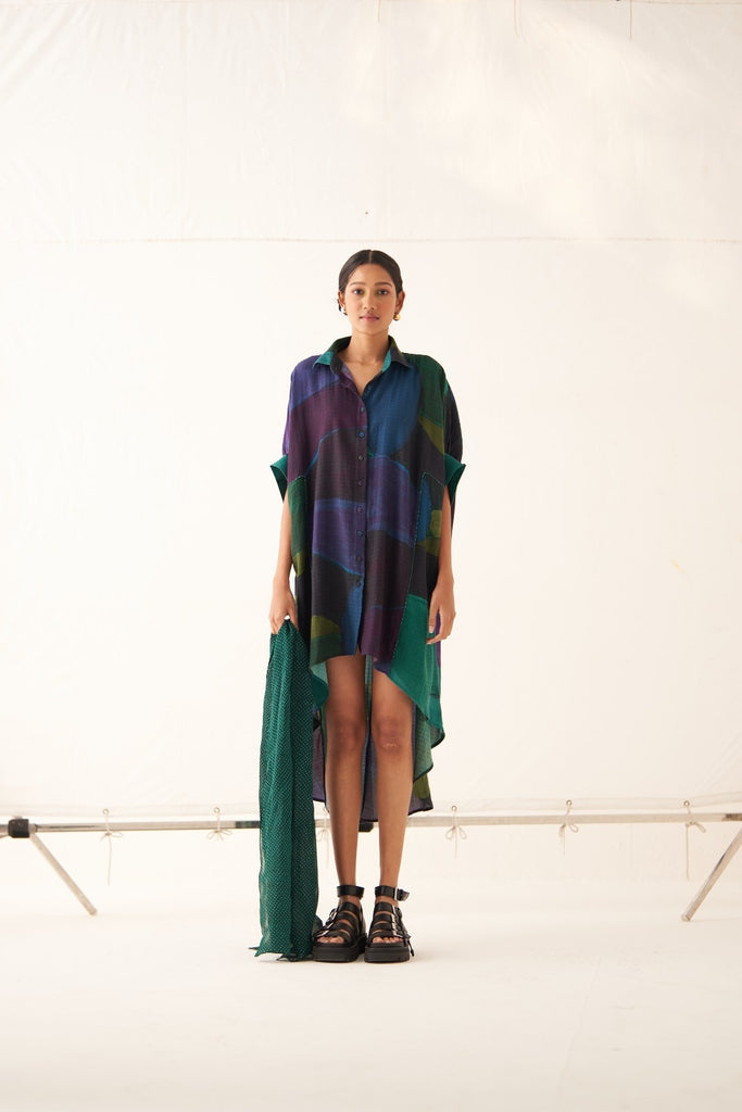 • GOT Certified Azo-free dyes, Anti-Fit, Hand-painted abstract expressionist digitally transferred print, Shirt collar with full front placket, High-low hem, Insert detailings at front, Back yoke with center back insert, Batwing sleeves, and Hand-embossed vintage Indian coin detail at back. Front length is 32" and back length is 47.5".