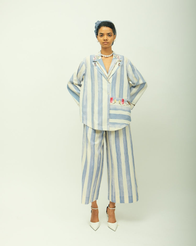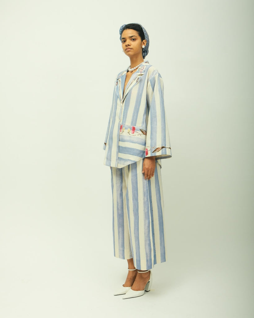 Details: Notched lapel collar, full sleeves, hand-painted abstract expressionist digitally transferred print florals appliqued, curved hem, embroidered florals on cuffs, side pockets.