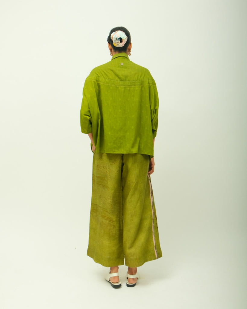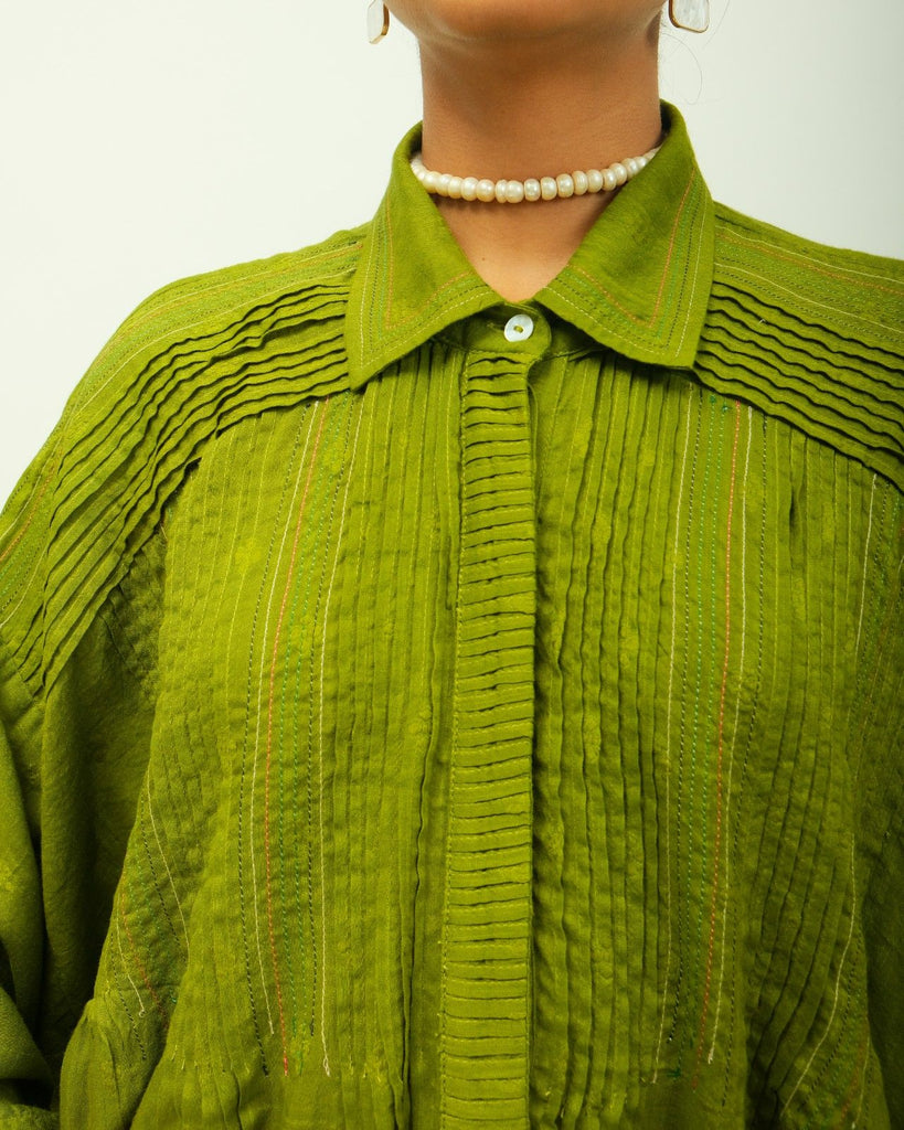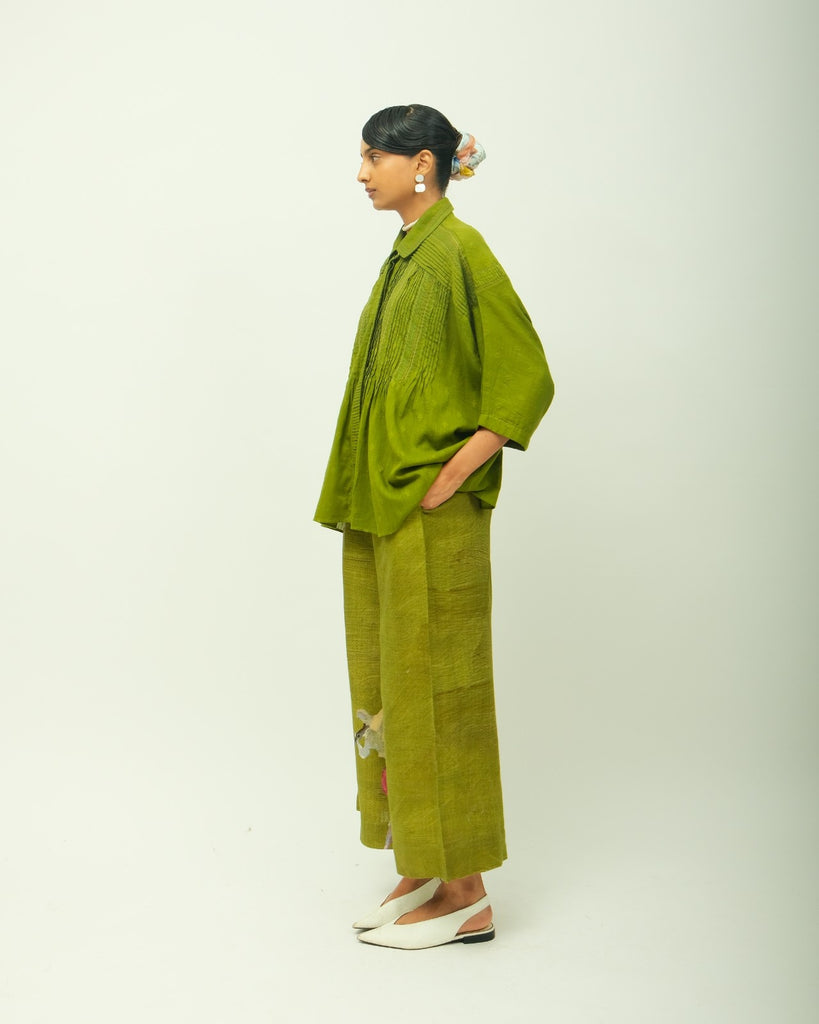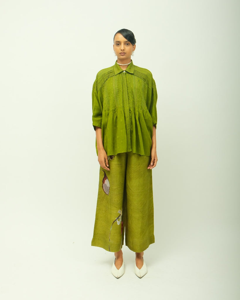 Anti-fit, short-sleeved top with a relaxed silhouette. Features vertical pin tucks on the front, crafted from lightweight jacquard fabric. This piece offers both comfort and understated elegance. Variations in color, texture, and weave are inherent due to the hand-made nature of the garment.