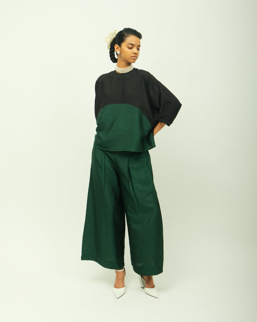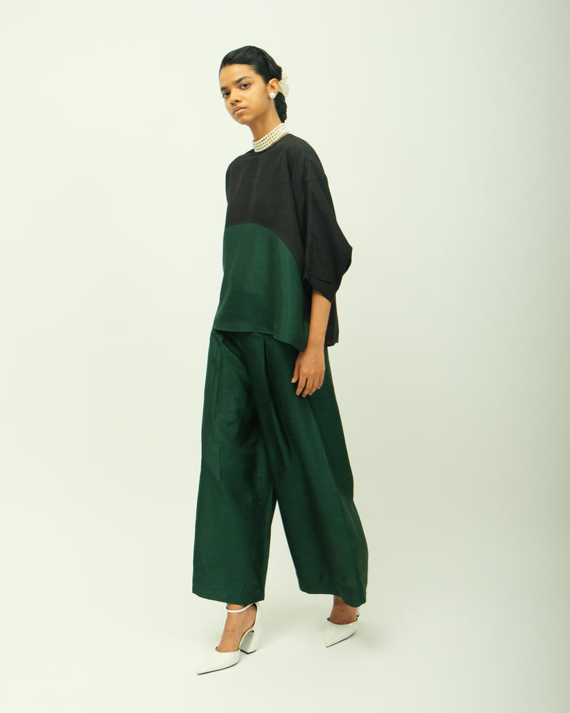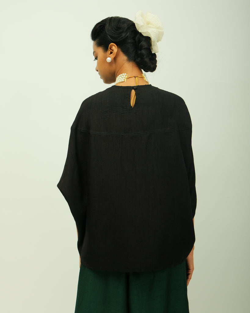 Anti fit, zero neckline, dropped shoulders with wide sleeves, perfect for layered styling & contemporary wardrobes, light weight raw silk textile. Single piece.