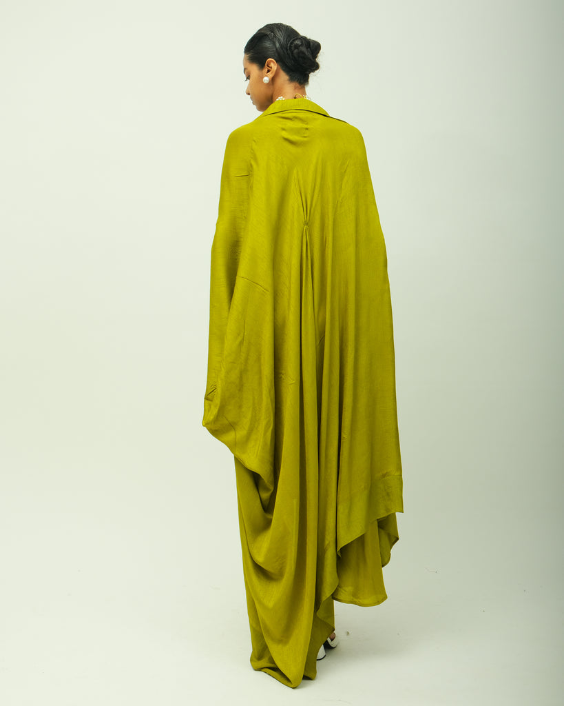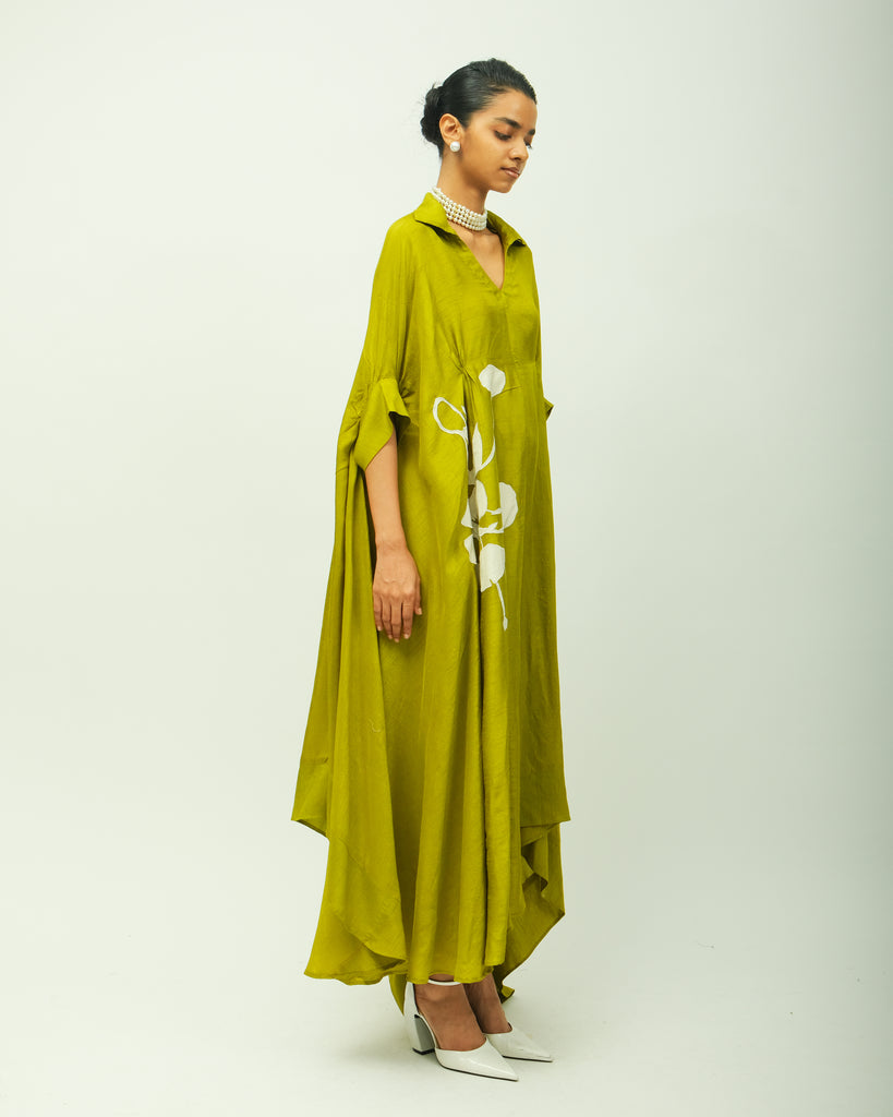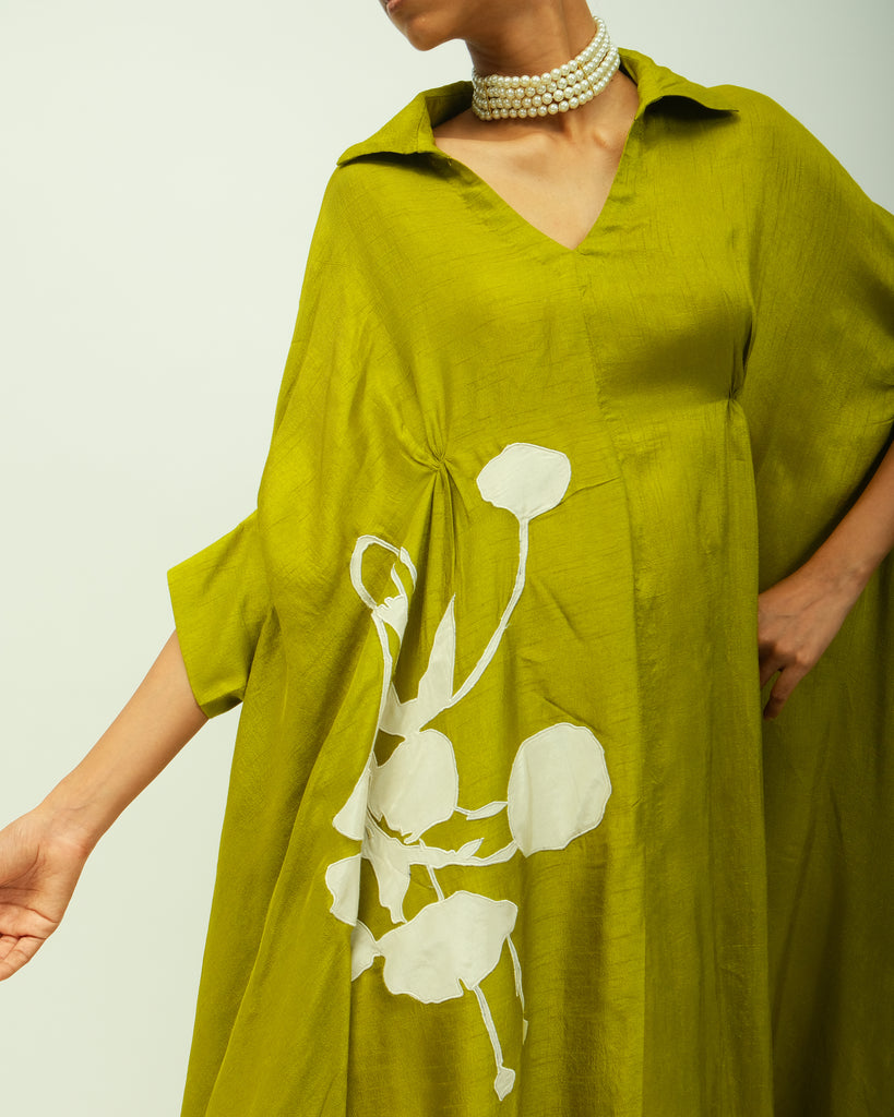 Anti-Fit, V-neck and wide elbow-length sleeves, side slit, features circular patches in a contrasting color appliqued, comfortable and flowing silhouette.- single piece.