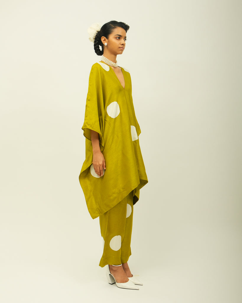 Anti-Fit, shirt collar, bellle sleevs, bead detailing, hand embroidered polka motifs appliqued --single piece.