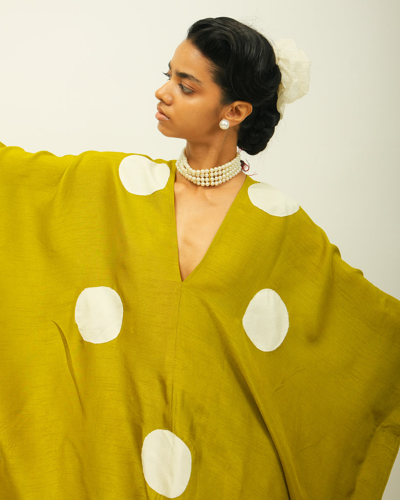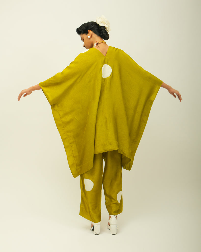 - Anti-Fit, V-neck and wide elbow-length sleeves, side slit, features circular patches in a contrasting color appliqued, comfortable and flowing silhouette..- single piece