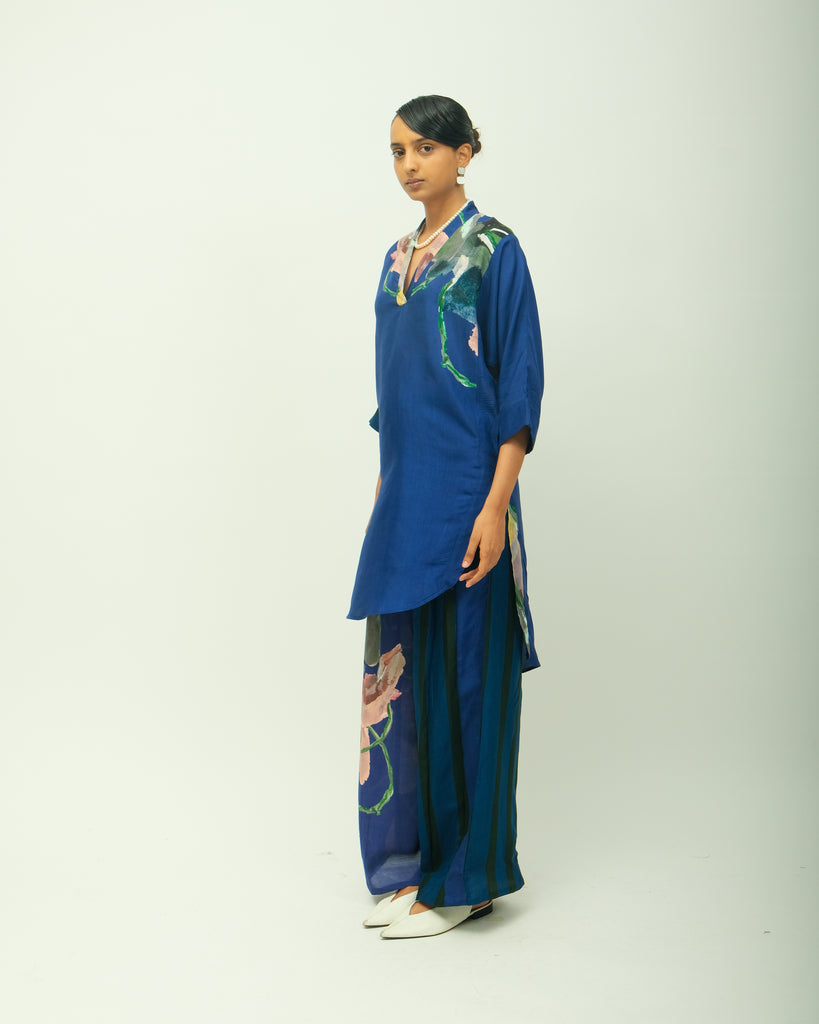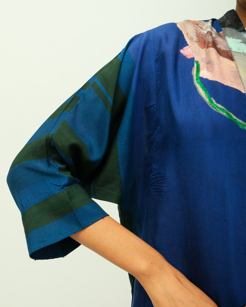 Relaxed fit, V-neckline, three-quarter sleeves, lightweight material, hand-painted abstract expressionist digitally transferred print, bead detailing, Print placement may vary - single piece. Garment Length -