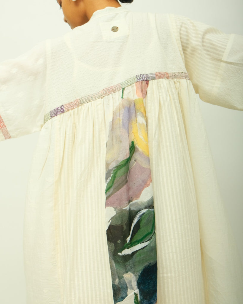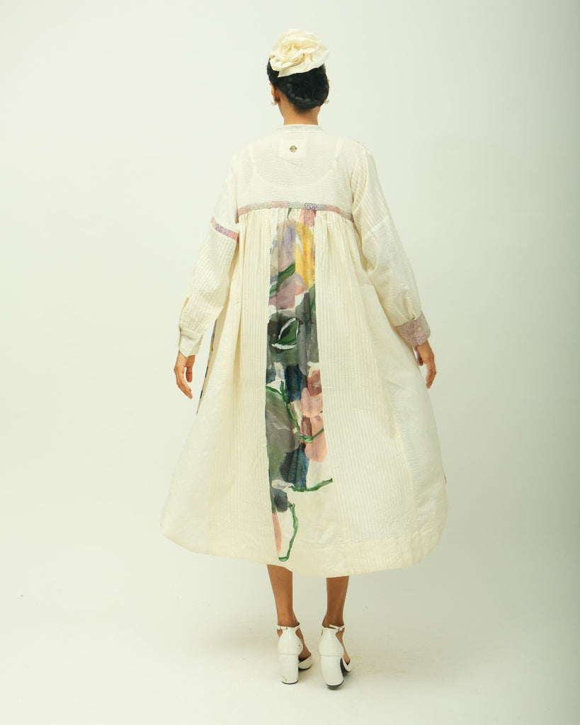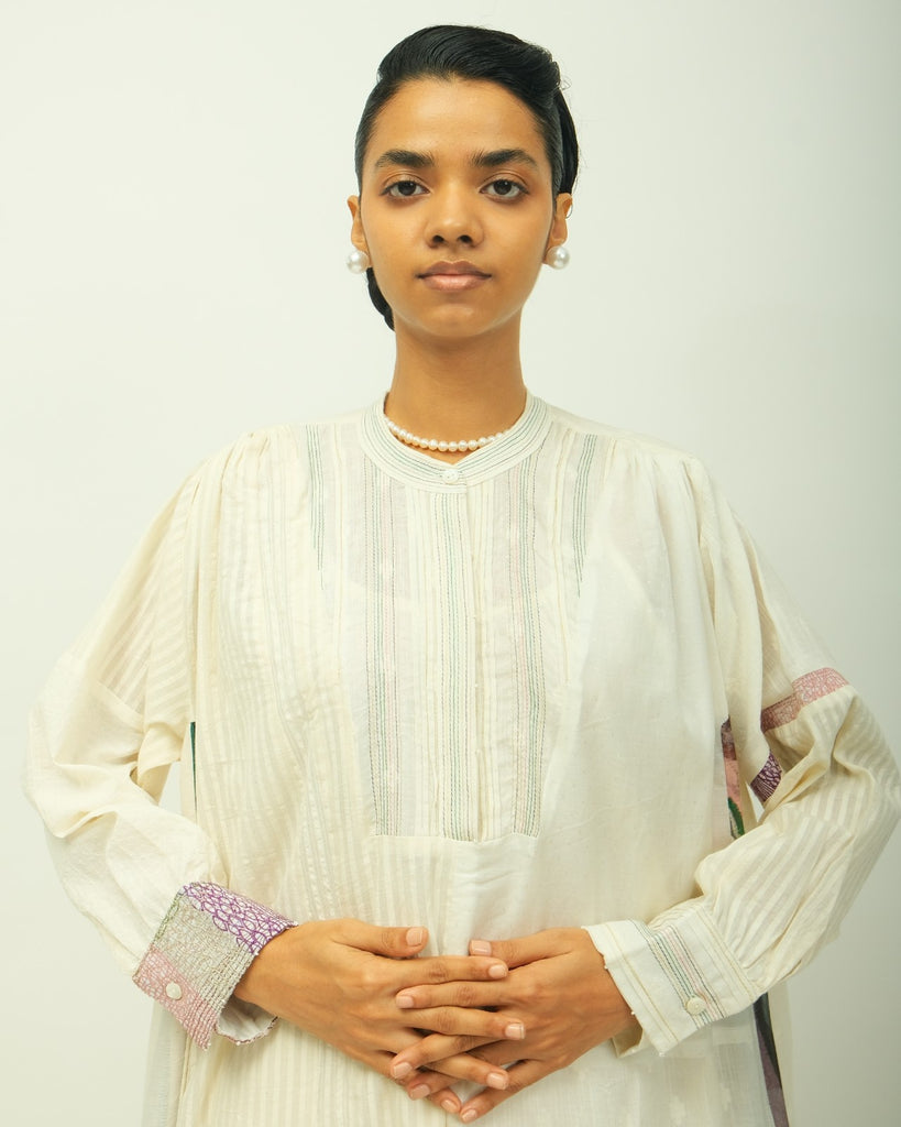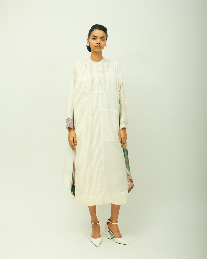 Anti-fit dress featuring a mandarin collar and pintuck detailing along the yoke. Designed with subtle gathers at the shoulders, a half front placket, and full-length sleeves. The cuffs and sleeves are accentuated with delicate beadwork and hand embroidery. Crafted in a lightweight fabric, this piece offers ease and elegance.