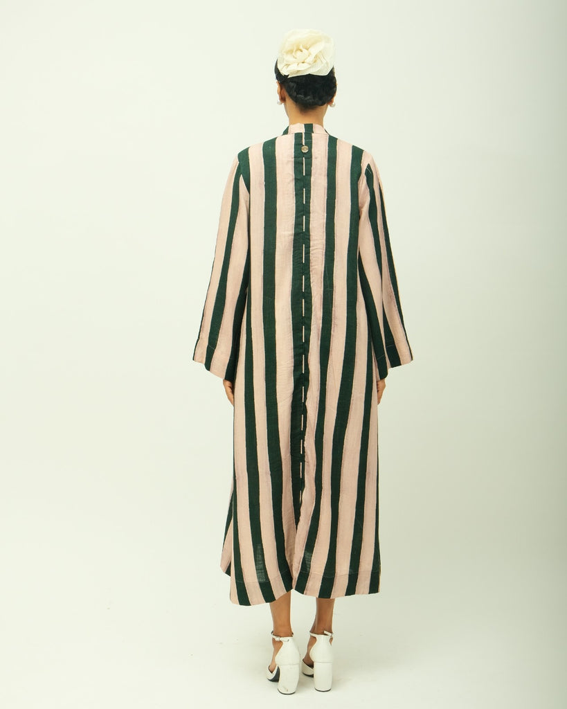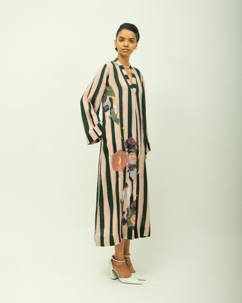 Relaxed anti-fit dress featuring a soft V-neckline and full-length sleeves, accentuated with delicate bead detailing. Adorned with a hand-painted abstract expressionist print, digitally transferred for precision and vibrancy. Finished with topstitched side pockets for added utility.