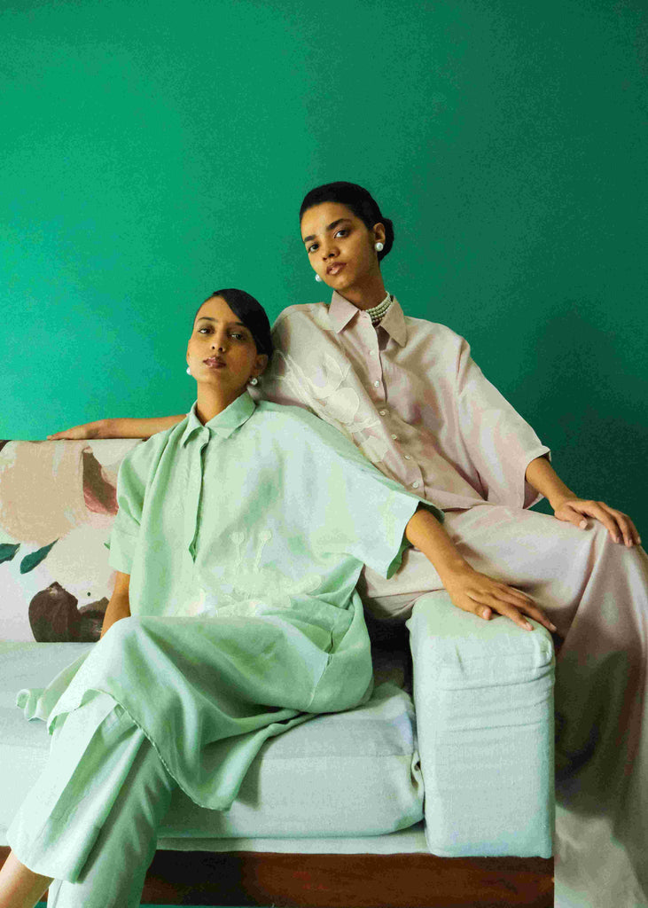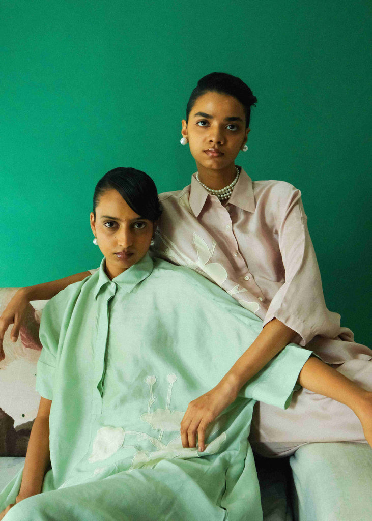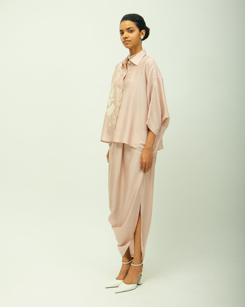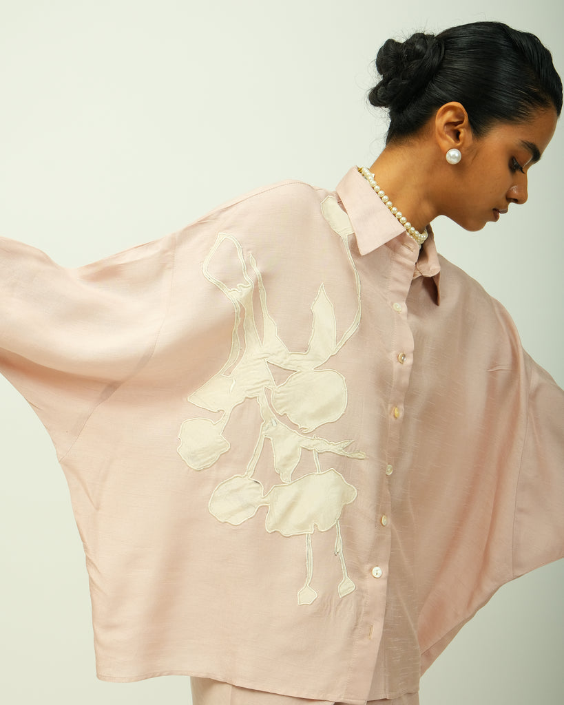 - Dolman-sleeved shirt crafted in soft raw silk, featuring a relaxed silhouette with a fluid drape. Designed with a classic shirt collar, front button placket, and elbow-length sleeves seamlessly. adorned with ivory botanical appliqué on one side, adding depth and artisanal texture. single peice