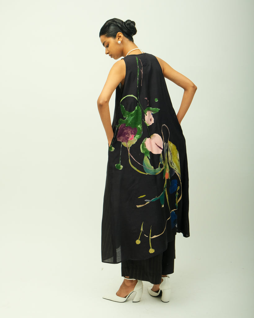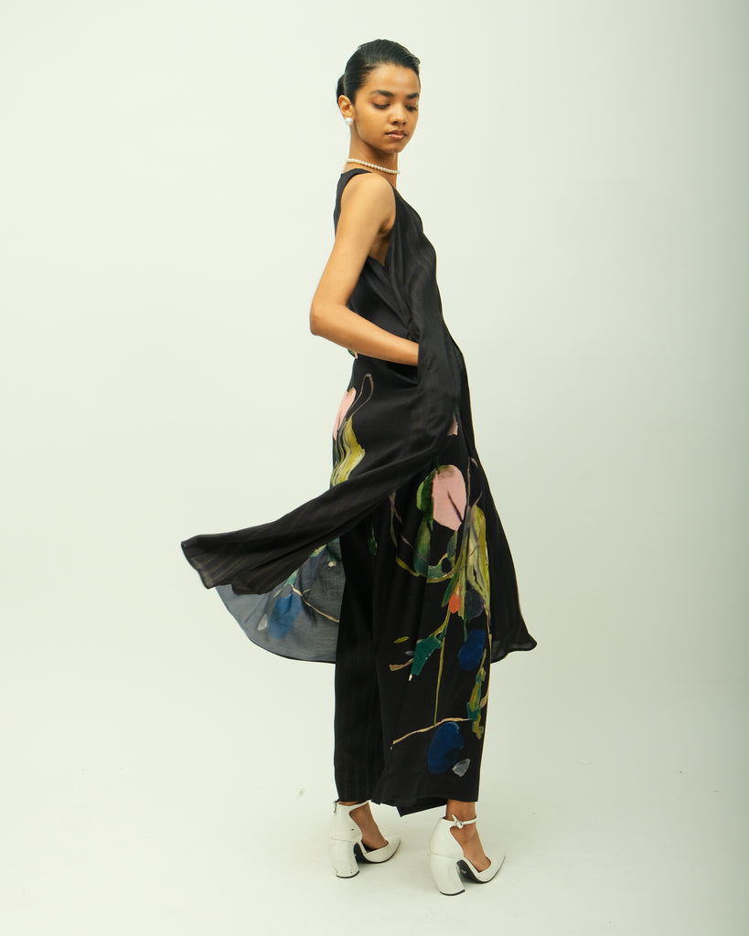 - High-waisted wide-leg trousers with matching vertical stripes. One leg is adorned with a digitally printed floral motif, originally hand-painted for an artisanal touch. print placement may vary