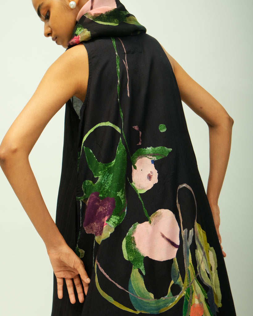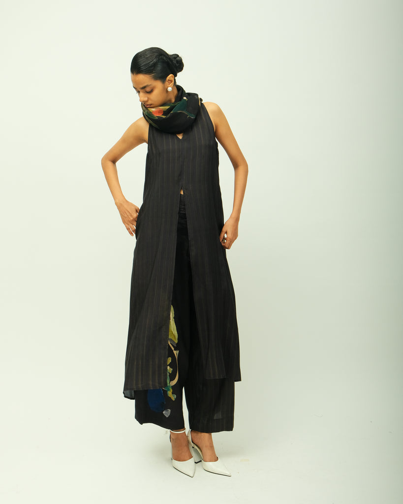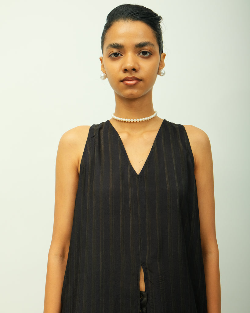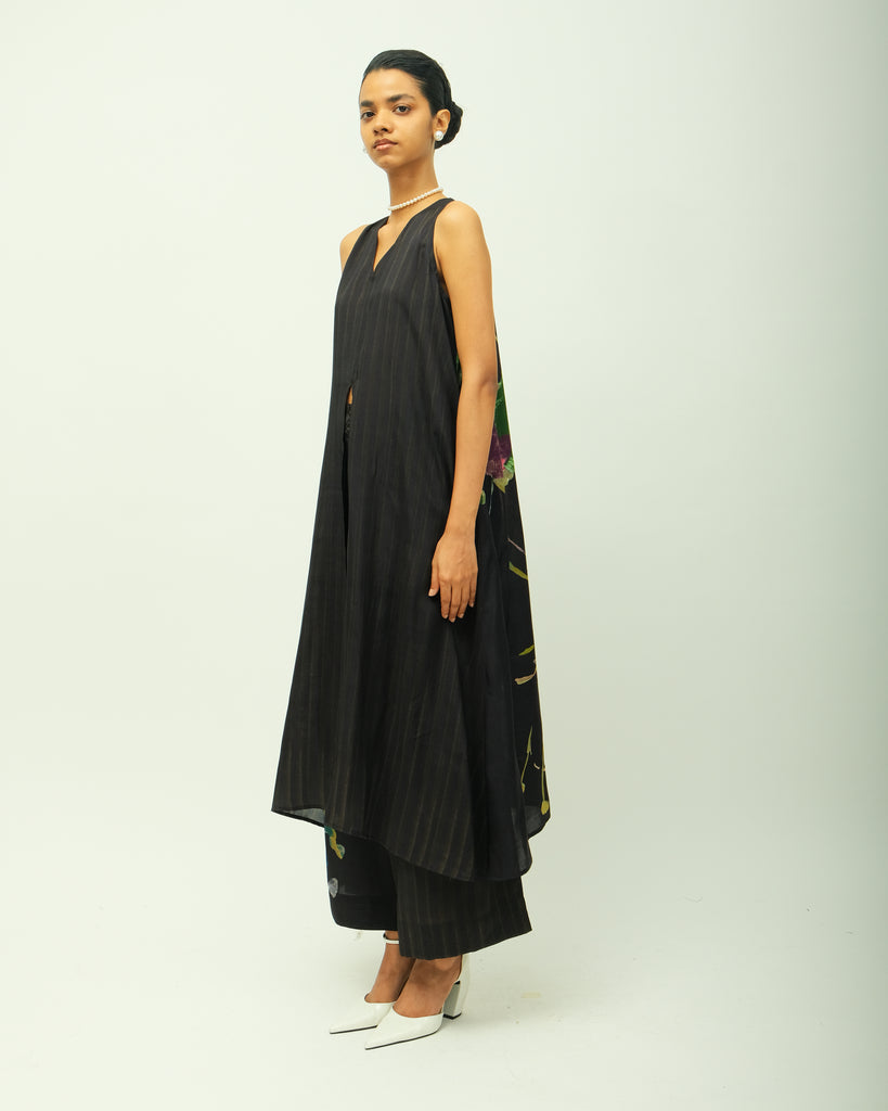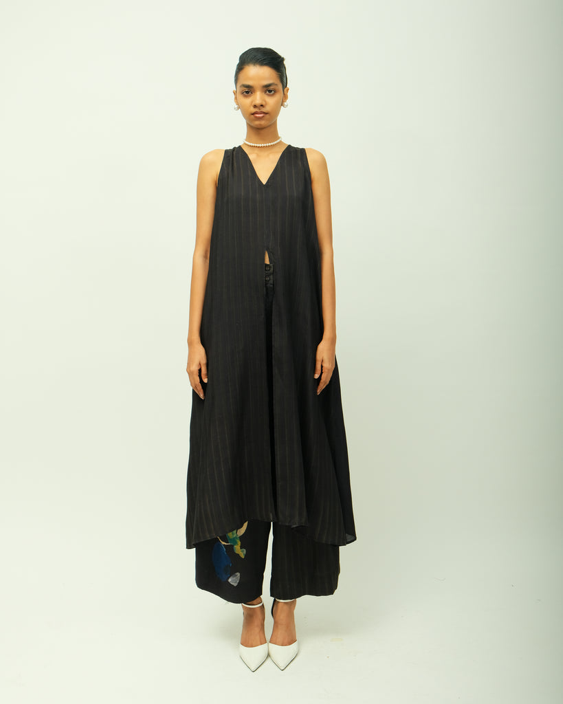 Anti-fit V-neckline, flared overlay dress, with subtle pinstripes horizontal seam detail, the outfit is made from lightweight textiles. Minimal elegance with artistic flair -Single Piece.