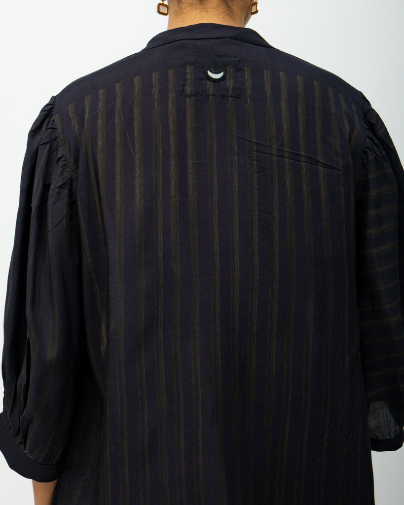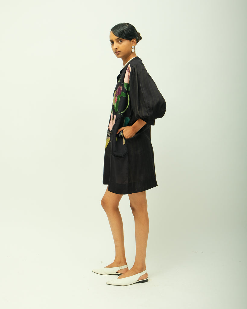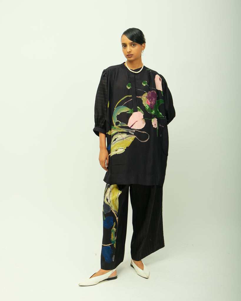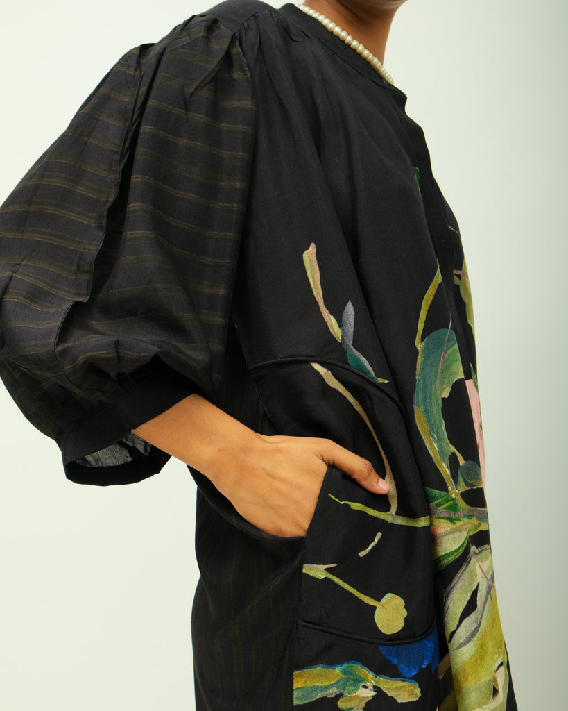 Anti fit tunic featuring a round neckline with the half front placket, voluminous three quater sleeve with tonal stripe texture gathered at the armhole. The front is adorned with a digitally printed floral motif, originally hand-painted for an artisanal touch. single peice.