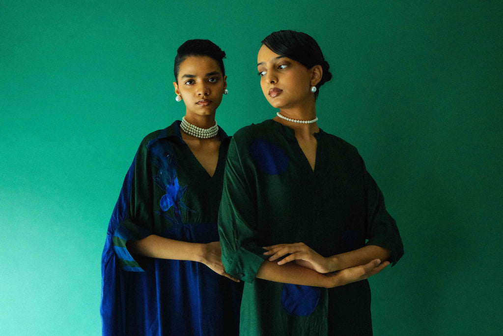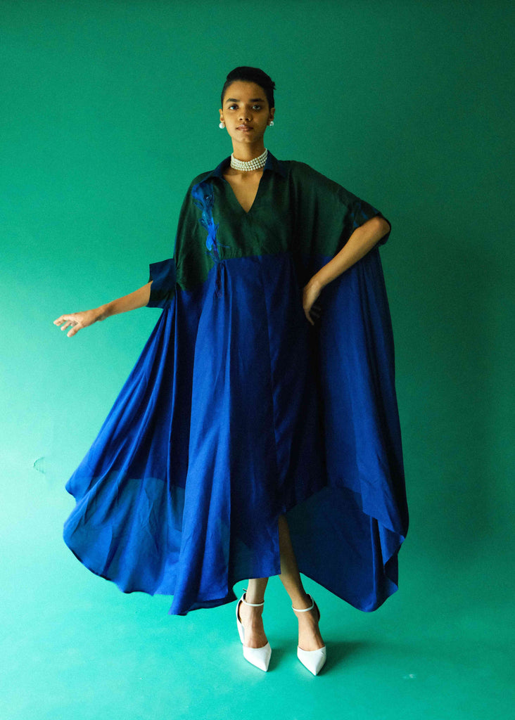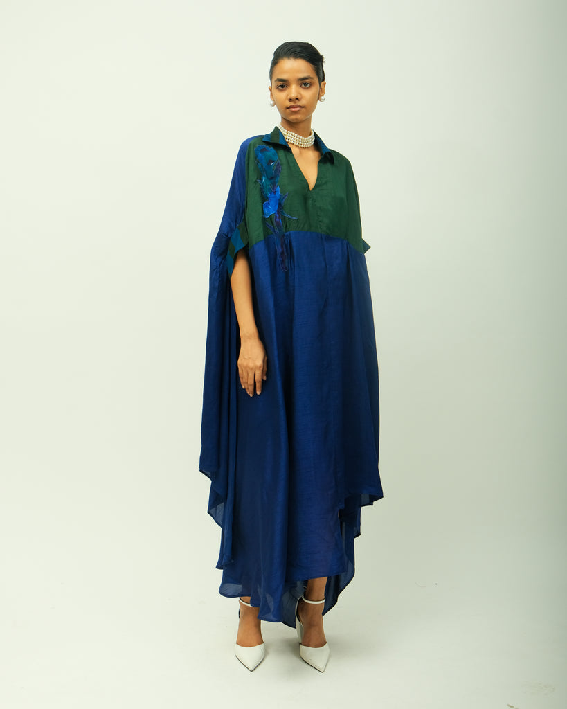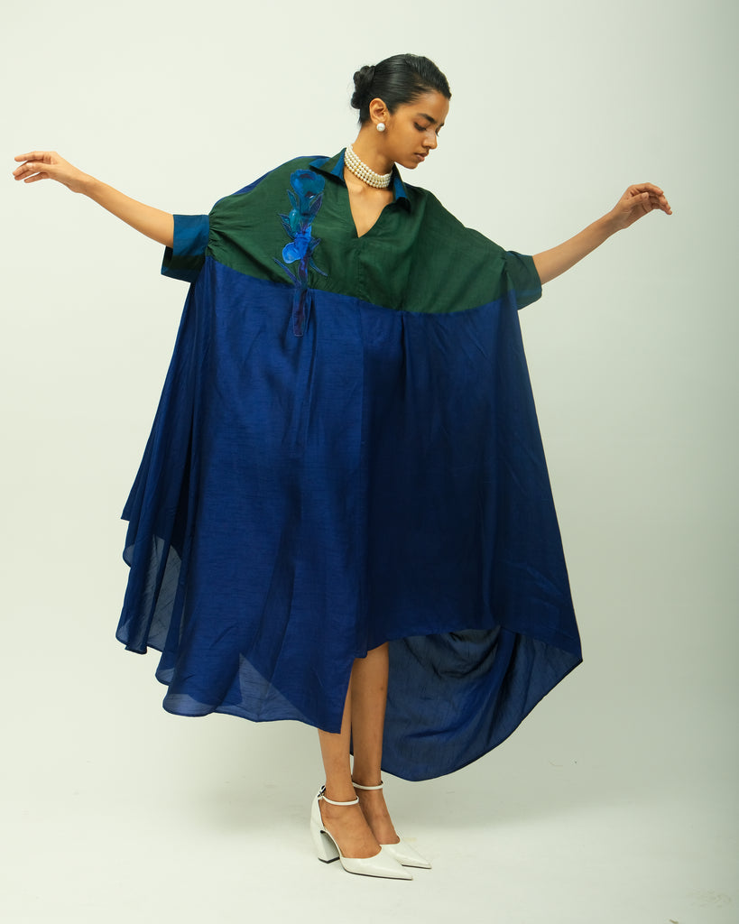 Anti-Fit Dress, V-neckline, spread collar, color-blocked design, lightweight textile, bead detailing, hand embroidered applique floral on one shoulder Print placement will vary—single piece.
