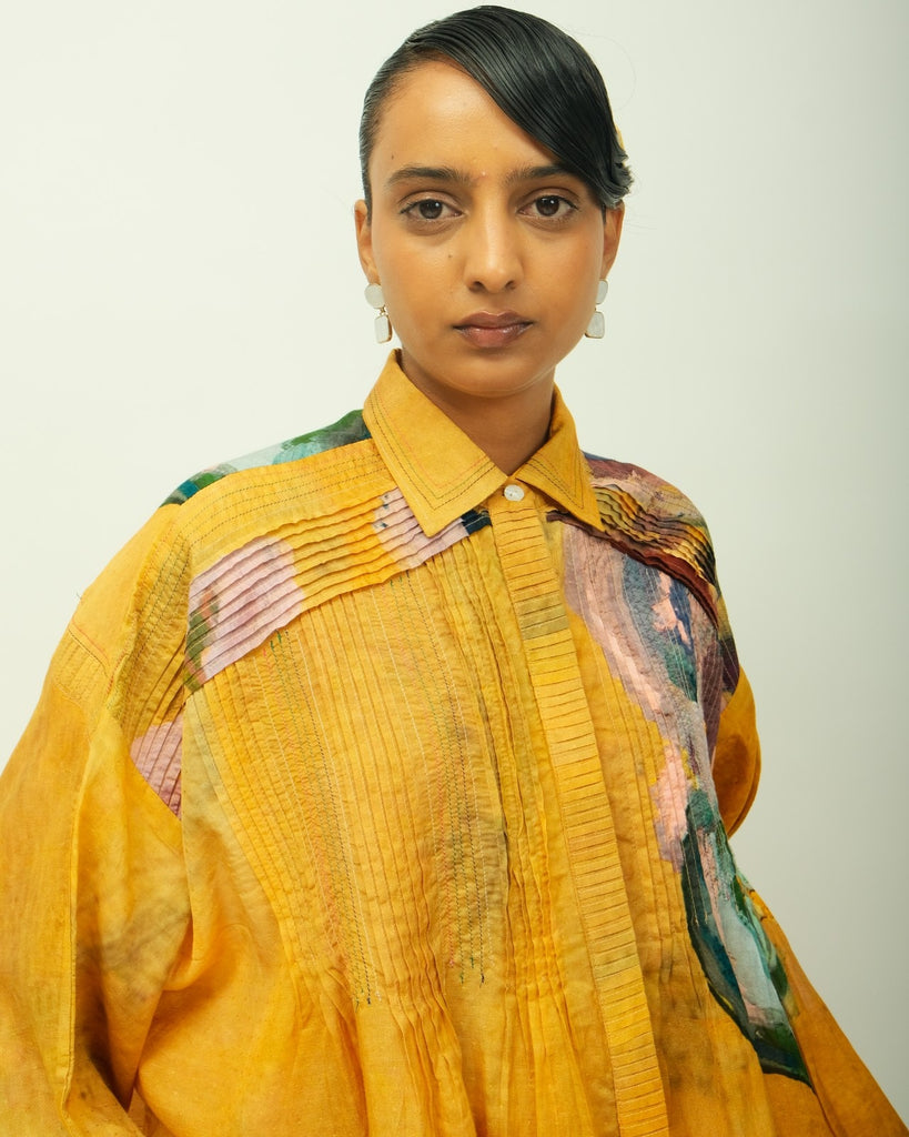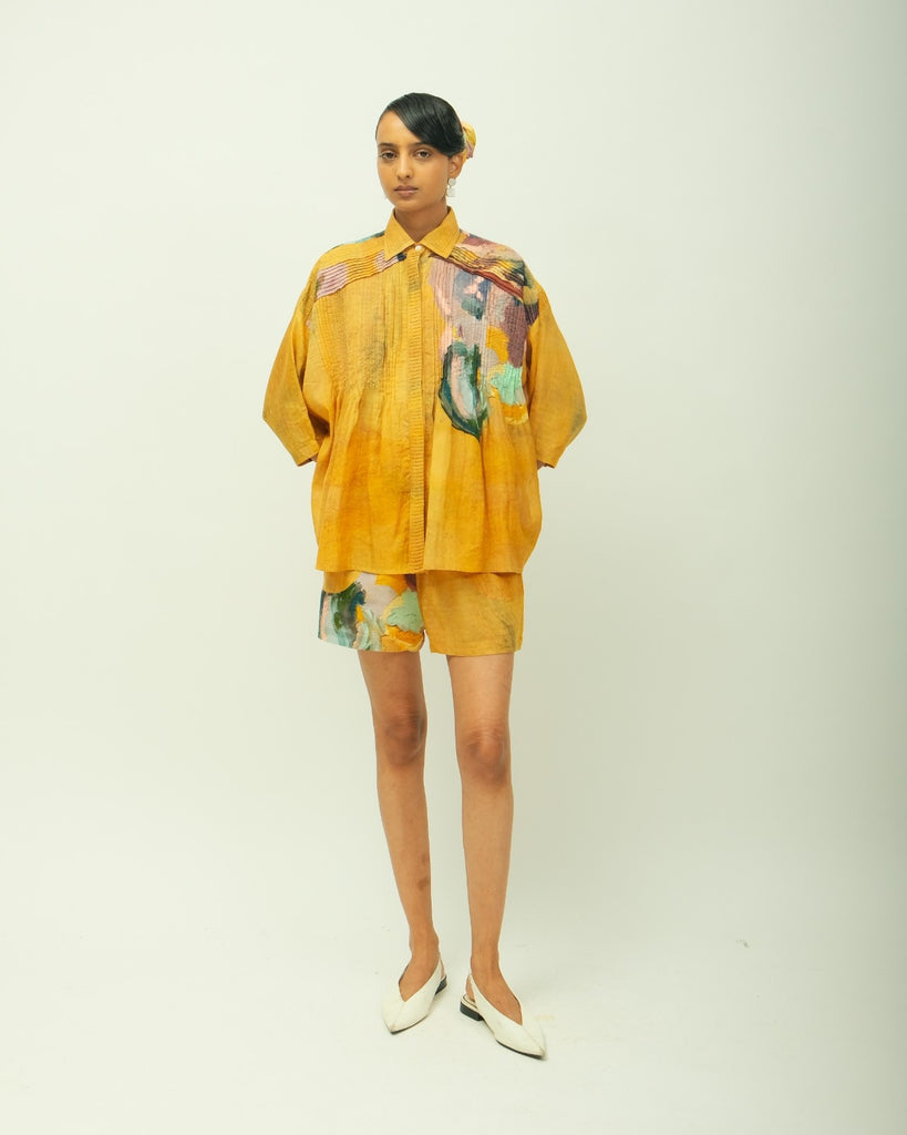High-waisted ochre shorts with a relaxed fit and drawstring, featuring digitally developed prints derived from original hand-painted artworks.