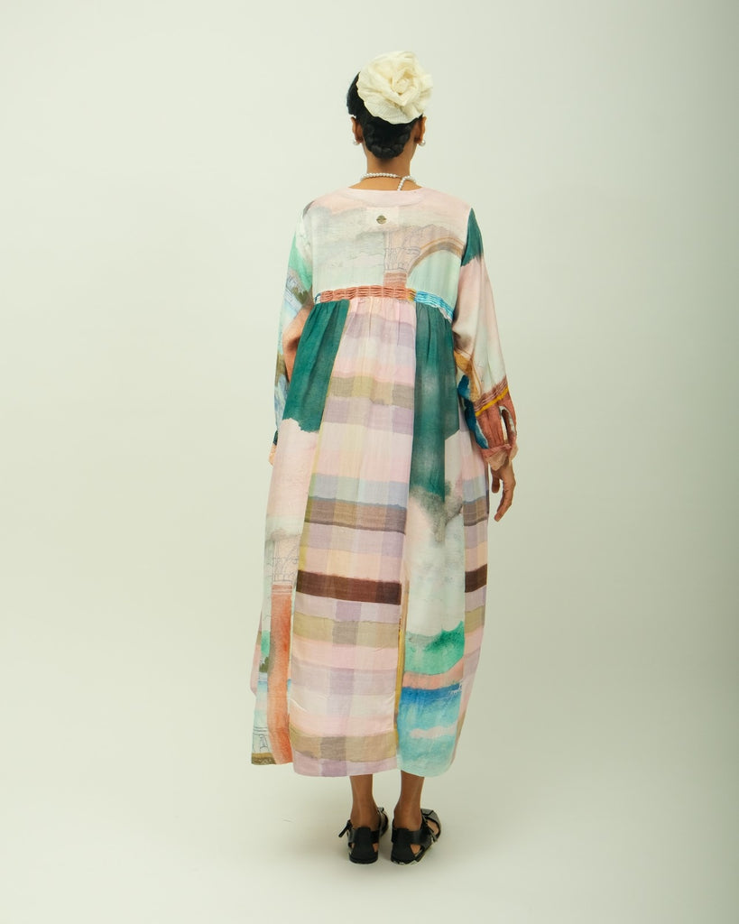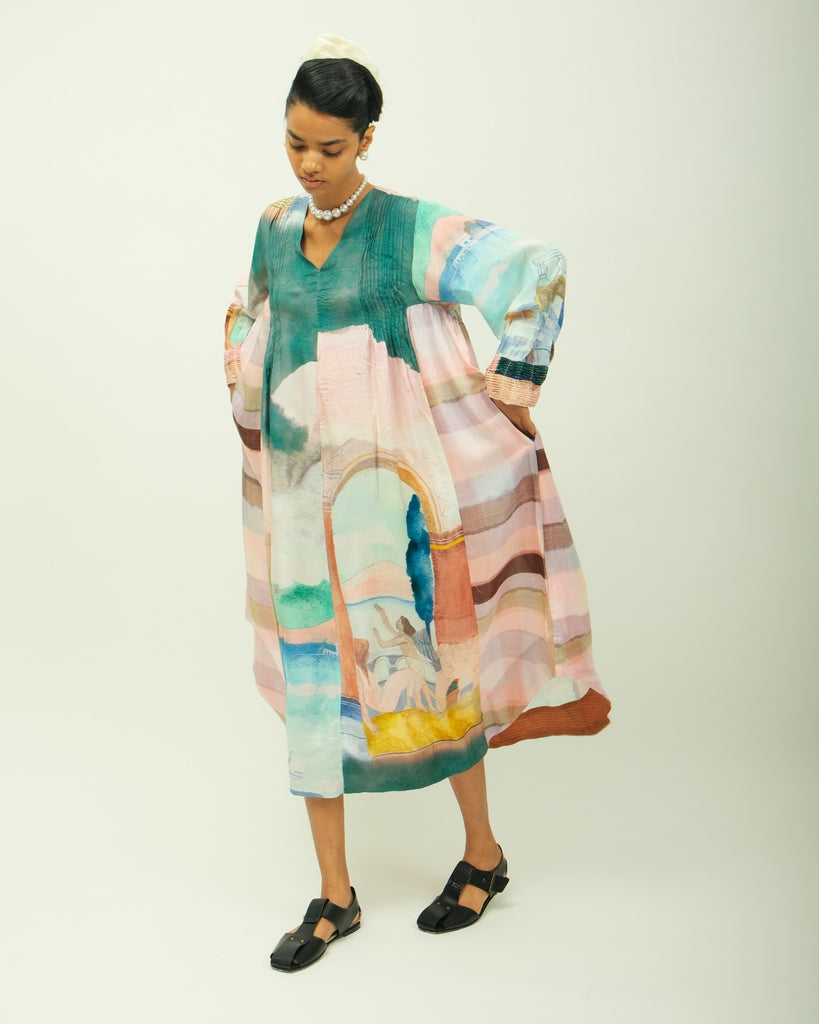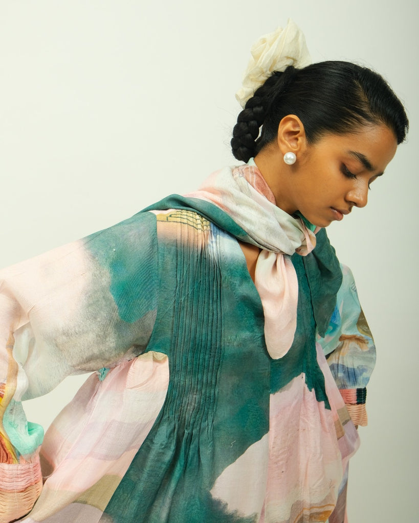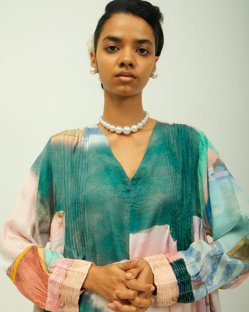 Anti-fit, V-neckline, full sleeves, lightweight material, pin tucks on front, hand-painted abstract expressionist digitally transferred print, bead detailing, side pockets.