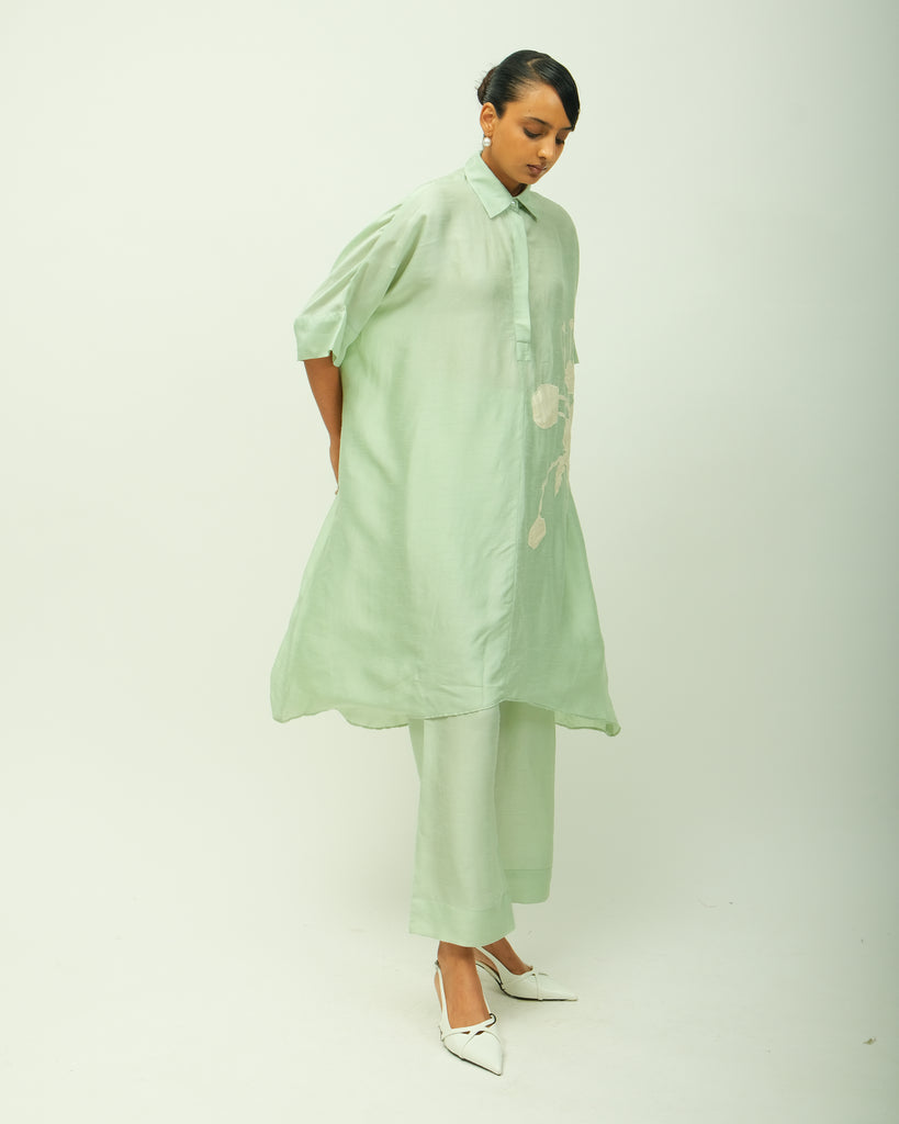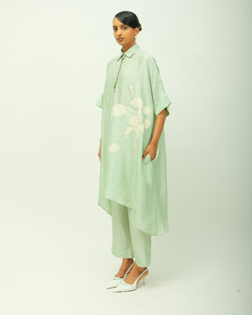 - Aniti-fit, raw silk tunic with a soft, flowy silhouette and asymmetrical hemline. Features a classic shirt collar with a concealed placket, dropped shoulders, and elbow-length sleeves. Ivory floral appliqué detailing on the front adds a delicate handcrafted touch.