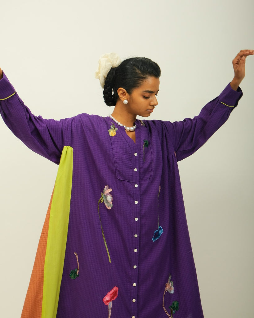 Single-piece anti-fit dress with features like a mandarin collar, long sleeves, buttoned cuffs, full placket, and side gathers. The floral artwork is hand-painted and digitally transferred, then appliquéd. Includes side pockets and detailed cording for added structure. Offers a relaxed silhouette with artisanal character.