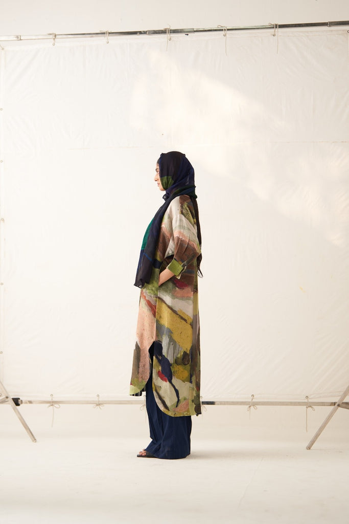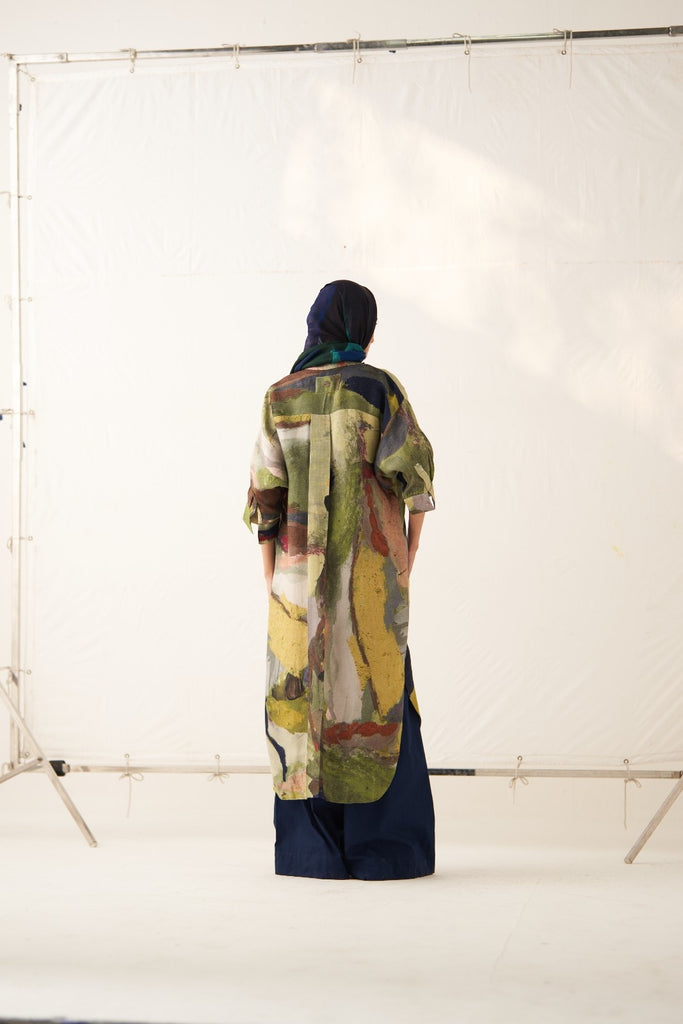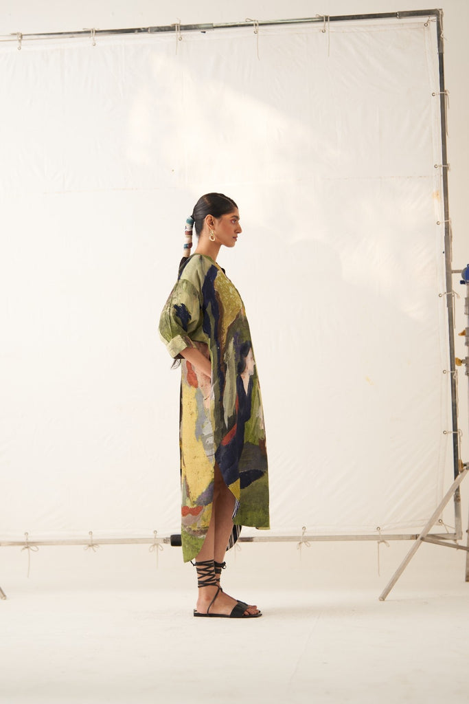 Kurta/Dress: GOT Certified Azo-free dyes, Anti-Fit, Hand-painted abstract expressionist digitally transferred print, Half-mandarin collar and full front placket, Quarter sleeves, Drop shoulder, High-low hem, Back yoke with box pleat, and Hand-embossed vintage Indian coin detail at back. Front length is 46" and back length is 47".