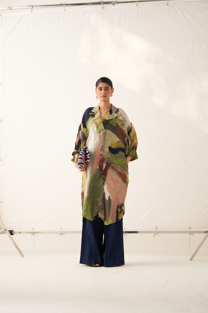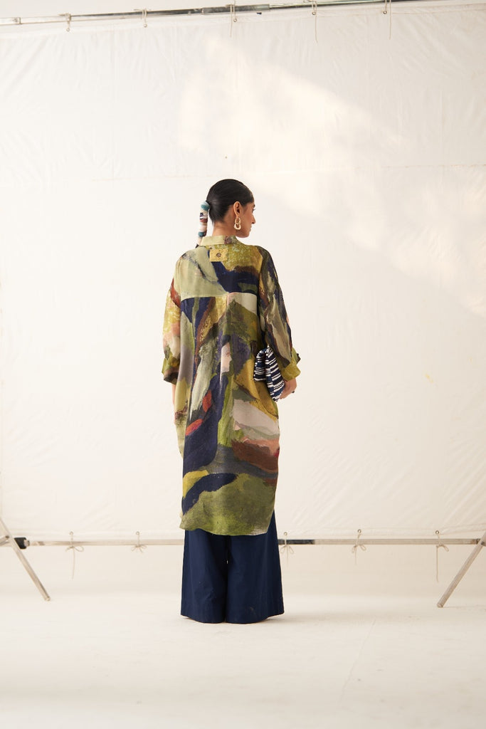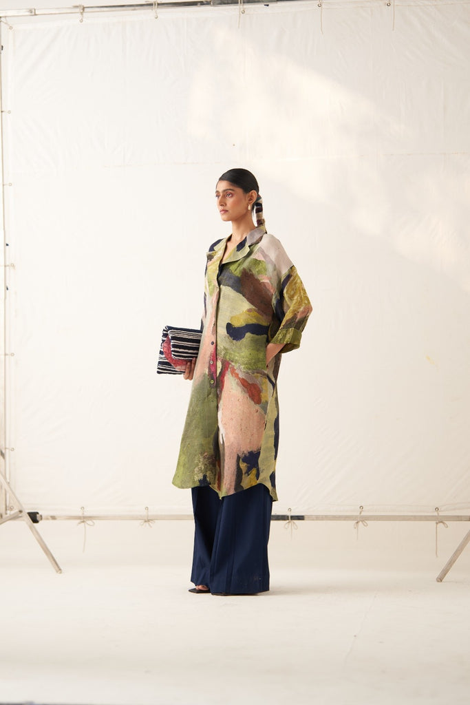 GOT Certified Azo-free dyes, Anti-Fit, Hand-painted abstract expressionist digitally transferred print, Lapel collar, Front full placket, back yoke with box pleat, and Hand-embossed vintage Indian coin detail at back. Front length is 44" and back length is 46".