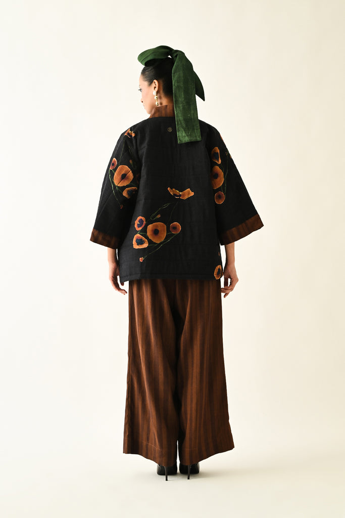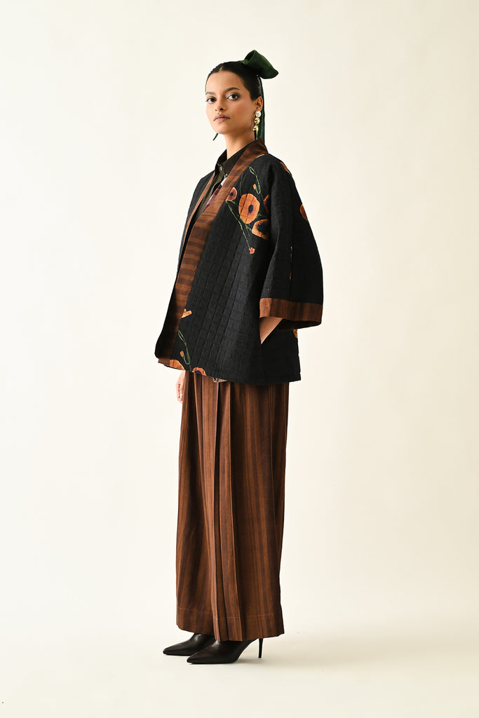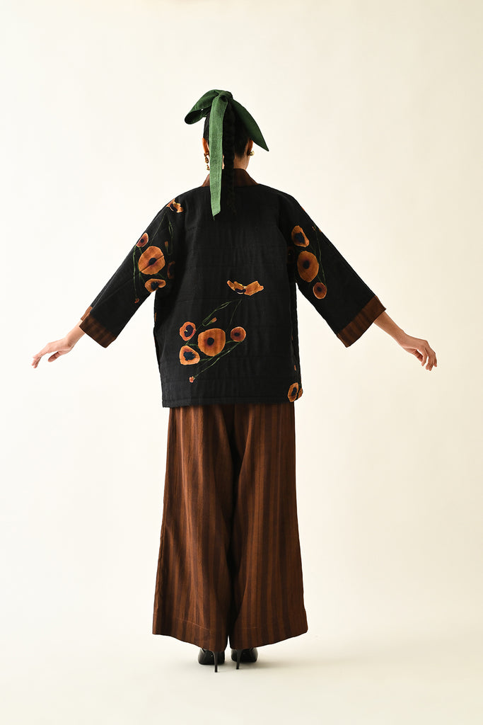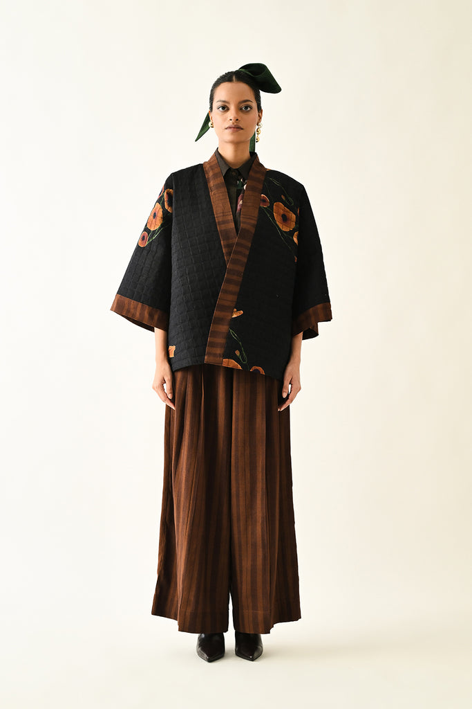 A handcrafted quilted jacket featuring a vibrant floral hand-painted pattern on a textured grid base. Designed with a relaxed, open-front silhouette and a contrasting striped lapel.