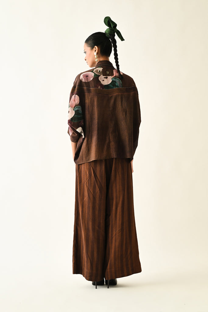 Anti fit, Pleated pants, Front zipper with button, hand-painted abstract expressionist digitally transferred print, side pockets.