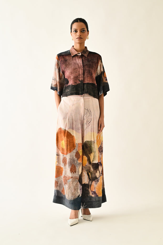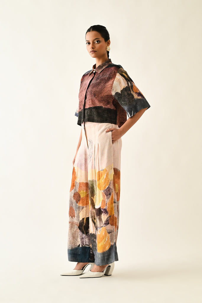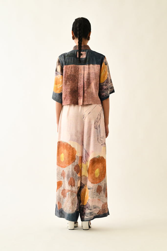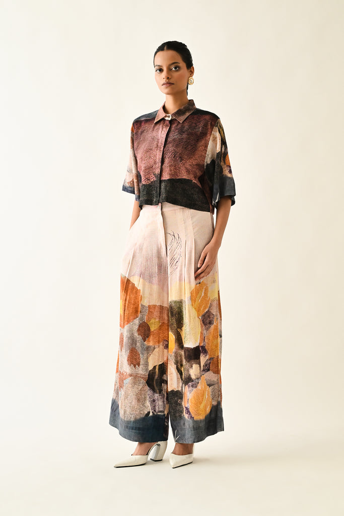 Anti-Fit cropped shirt, hand-painted abstract expressionist digitally transferred print, with back yoke and box pleat. Print placements will vary—single Piece.