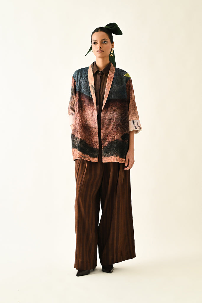 - Anti-fit jacket shirt is hand-painted abstract expressionist print, digitally transferred. The quilted shirt features a shawl collar, Kimono sleeves. Signature OFR lune embroidery at back. Print placements will varysingle piece. Model is wearing - XS/S