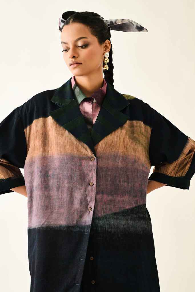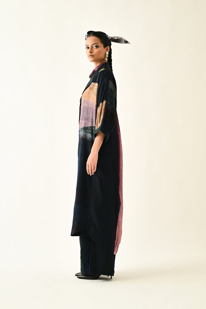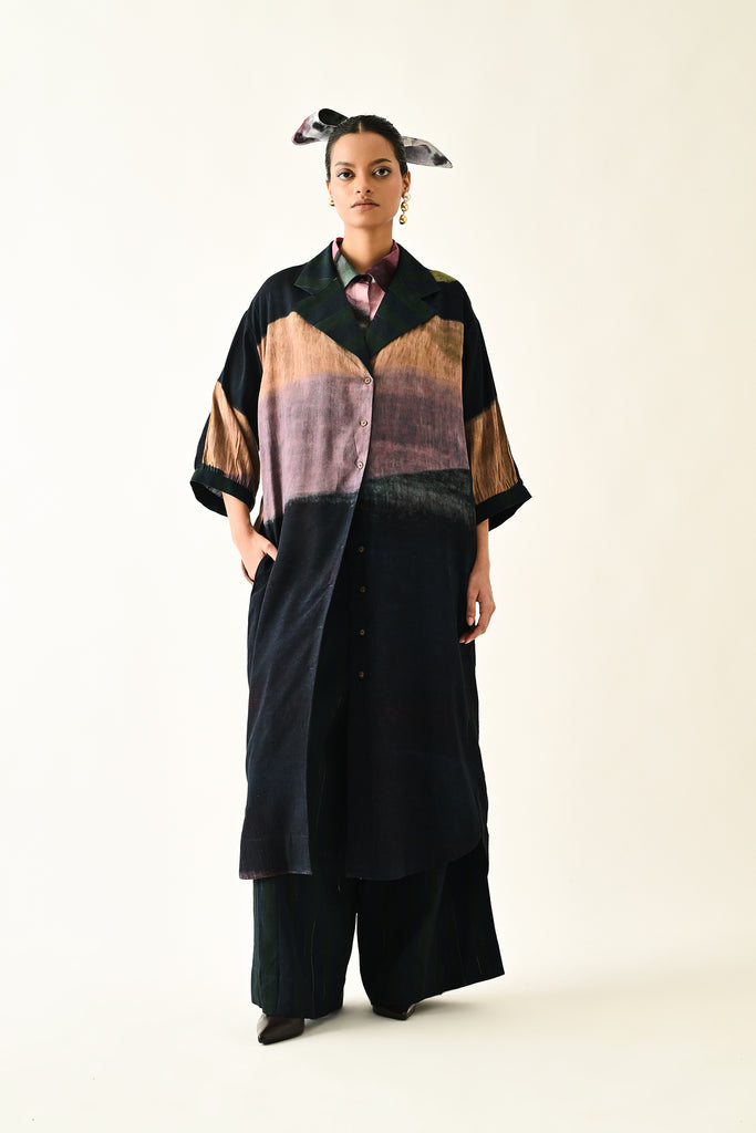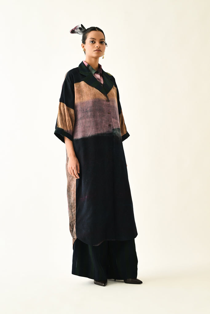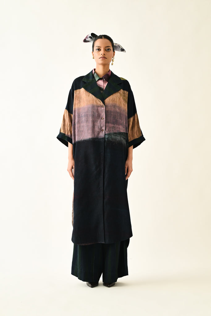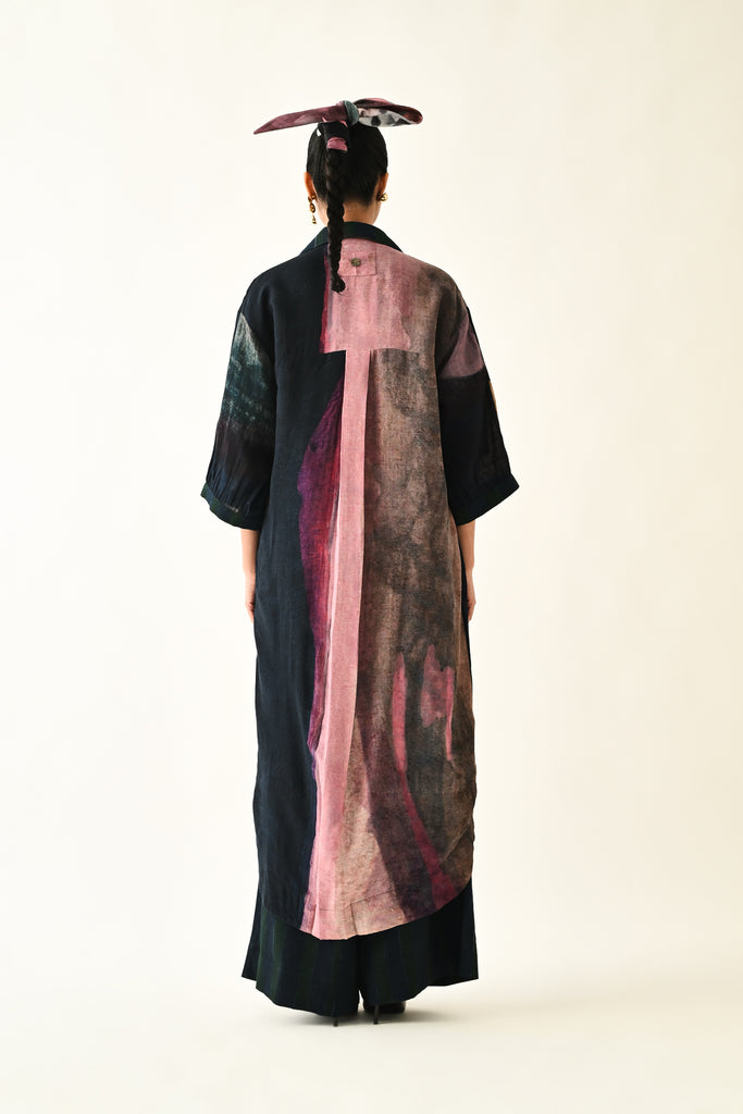 An Anti fit trench with Hand-painted abstract expressionist digitally transferred print, gathered sleeves, back yoke, box pleat at the back. Print placement will vary - single piece.