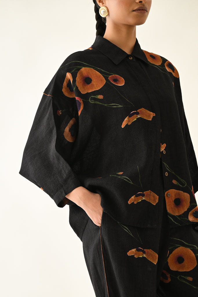 Anti fit Shirt featuring a hand-painted abstract expressionist print, digitally transferred. Designed with a shirt collar, front hidden placket. The back yoke is finished and coding insert. Print placements will vary—single Piece. Model is wearing size XS/S.