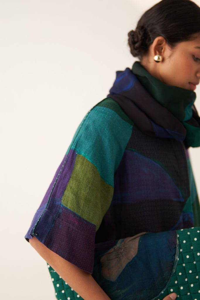 • GOT Certified Azo-free dyes, Anti-Fit, Hand-painted abstract expressionist digitally transferred print, Shirt collar, Concealed placket, Side seam pockets, Center back insert, Raglan sleeves, and Hand-embossed vintage Indian coin detail at back. Garment length is 33".