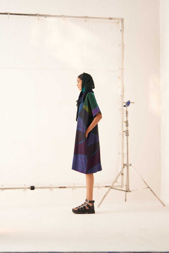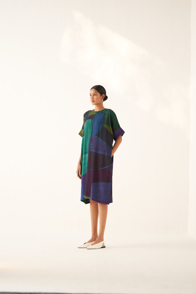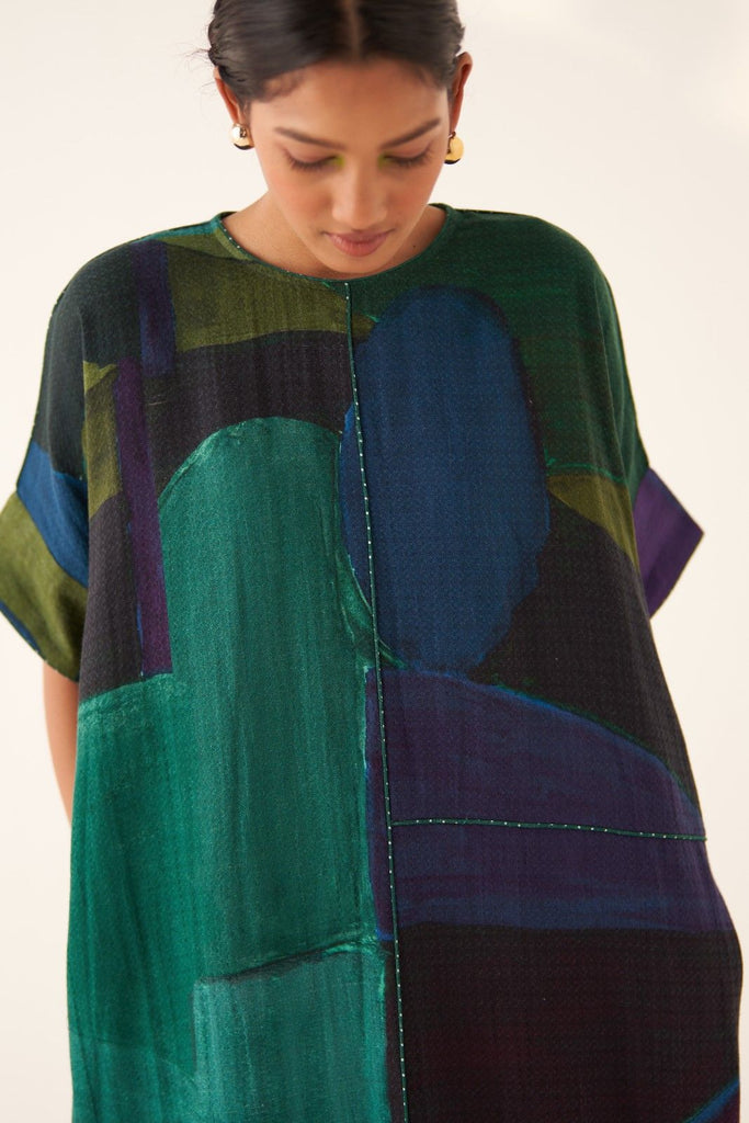 • GOT Certified Azo-free dyes, Anti-Fit, Hand-painted abstract expressionist digitally transferred print, Round neck, Insert detailing, Side seam pockets, and Hand-embossed vintage Indian coin detail at back. Garment length is 40".