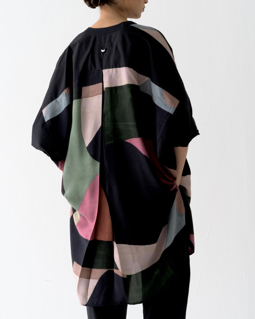 Upper: • Anti fit • Half collared V-neck • Box pleat details • High low hem • Variations in color, texture, and weave are inherent due to the hand made nature of the garment. | Garment Length : 38" | Model is XS-S and is wearing size M-L for an antifit look.