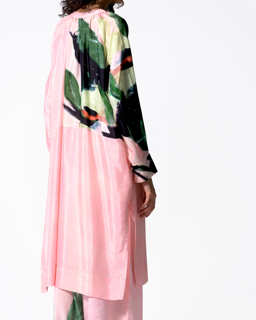 Upper: • Anti Fit • Gathered Neck • Front Placket • Raglan Sleeves • Inseam Pockets • Print placement design • Embroidery Detail • Variations in color, texture, and weave are inherent due to the hand made nature of the garment. | Wear 2 ways - Dress or an Overlay • Wear it with our slip dress or lowers to make it a set | Garment Length : 40" | Model is XS-S and is wearing size M-L for an antifit look.