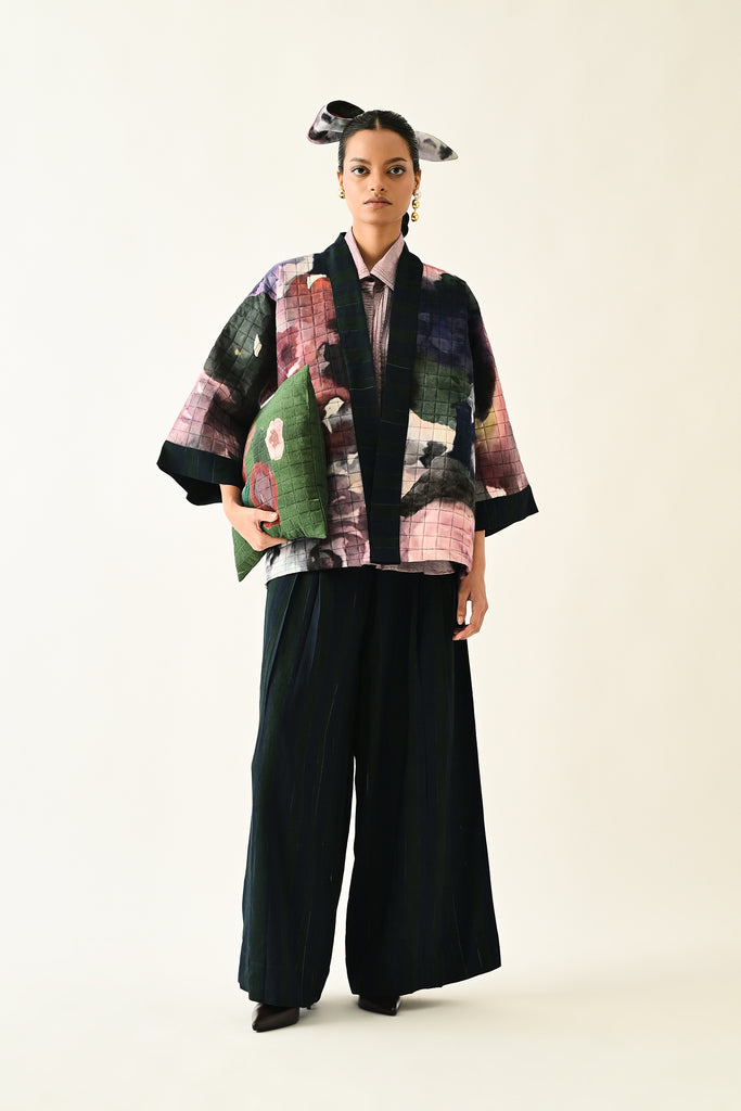 - A handcrafted quilted jacket featuring a vibrant floral hand-painted pattern on a textured grid base. Designed with a relaxed, open-front silhouette and a contrasting striped lapel.